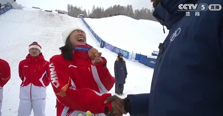赛后颁奖仪式上,徐梦桃笑着用英语向颁奖嘉宾调侃:这是我的第一枚奥运会铜牌。