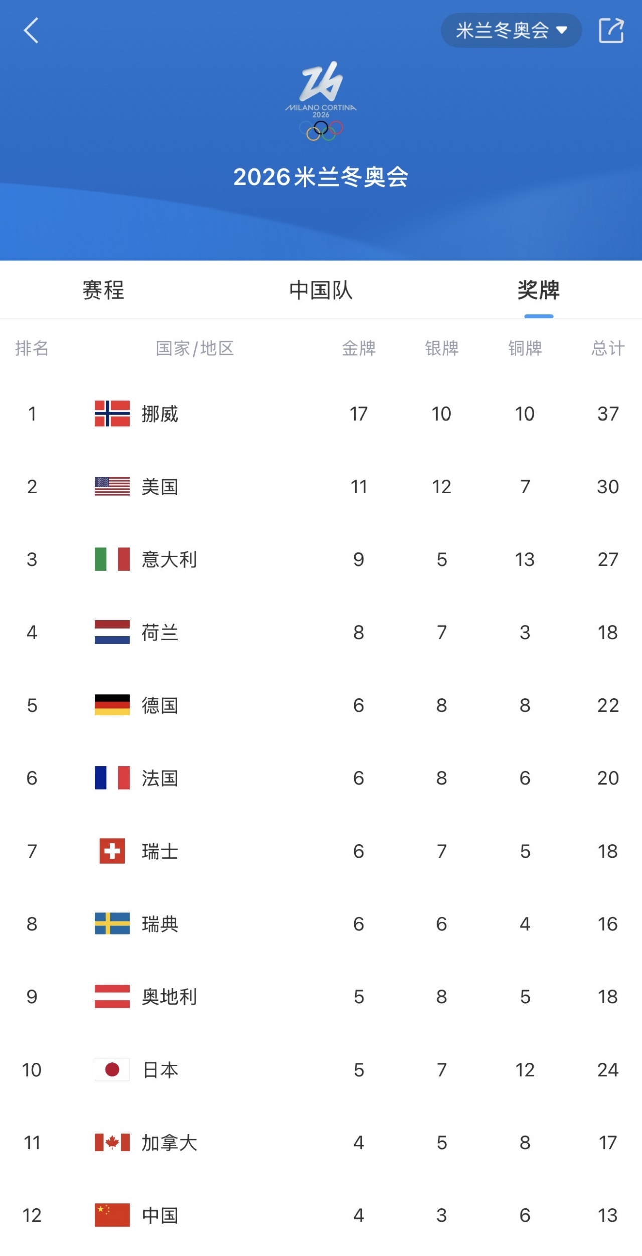 奖牌榜:中国队再添一铜,目前4金3银6铜仍居第12位