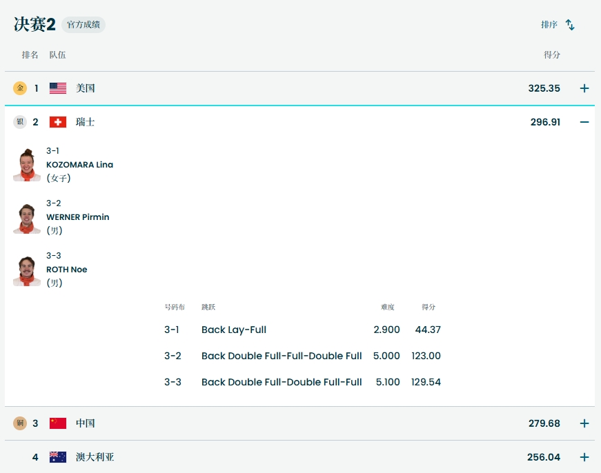 其中瑞士队在女选手科佐玛拉仅得44.37分的情况下,两名男选手皮尔明·维尔纳和诺埃·罗特以高难度的完美发挥,分别获得123.00分和129.54分,帮助瑞士队夺得银牌。