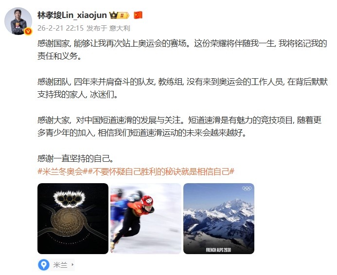 2月21日消息 米兰冬奥会短道速滑项目比赛已全部结束,林孝埈以“无奖牌”的成绩遗憾收场。林孝埈在社媒分享自己赛场照片并向国家、团队和大家表示感谢。
