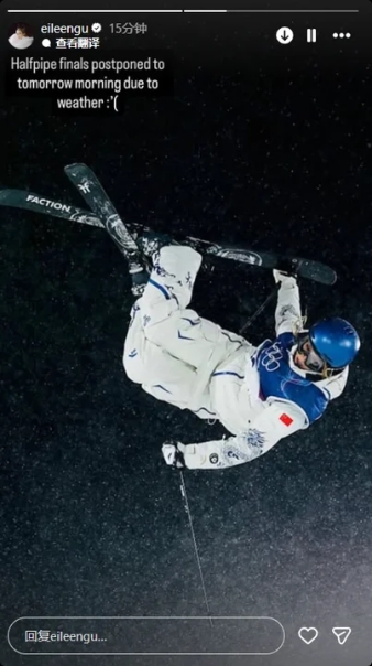 02月22日消息 谷爱凌更新社媒,确定原定凌晨02:30进行的冬奥会自由式滑雪女子U型场地技巧决赛,将延期进行。