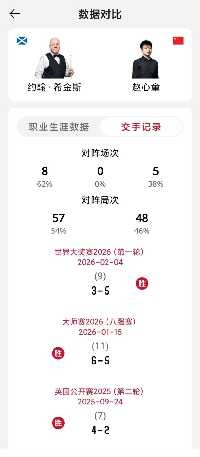 赵心童此前与希金斯交手战绩:赵心童5胜8负,但本月初击败希金斯