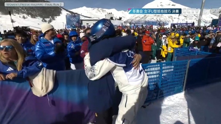 第二轮94分暂居第一!谷爱凌完成第二滑后到场边与母亲拥抱