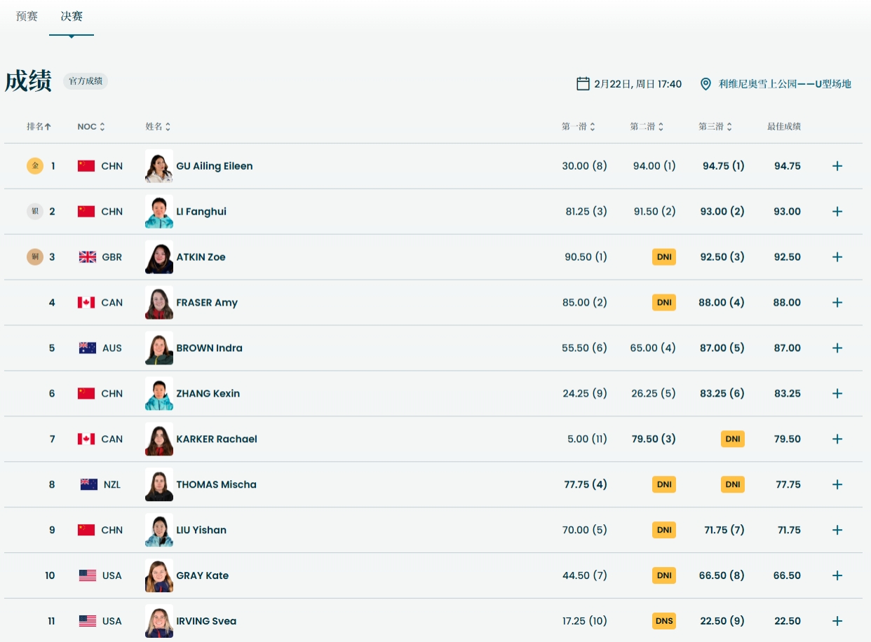 包揽金银!谷爱凌94.75分夺金 李方慧93分摘银英国选手92.5分摘铜