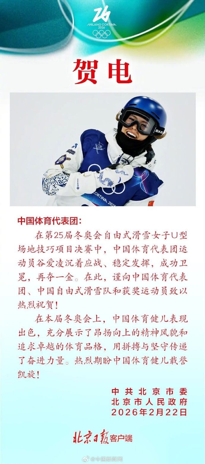 谷爱凌夺金!北京市委、市政府向中国体育代表团致贺电