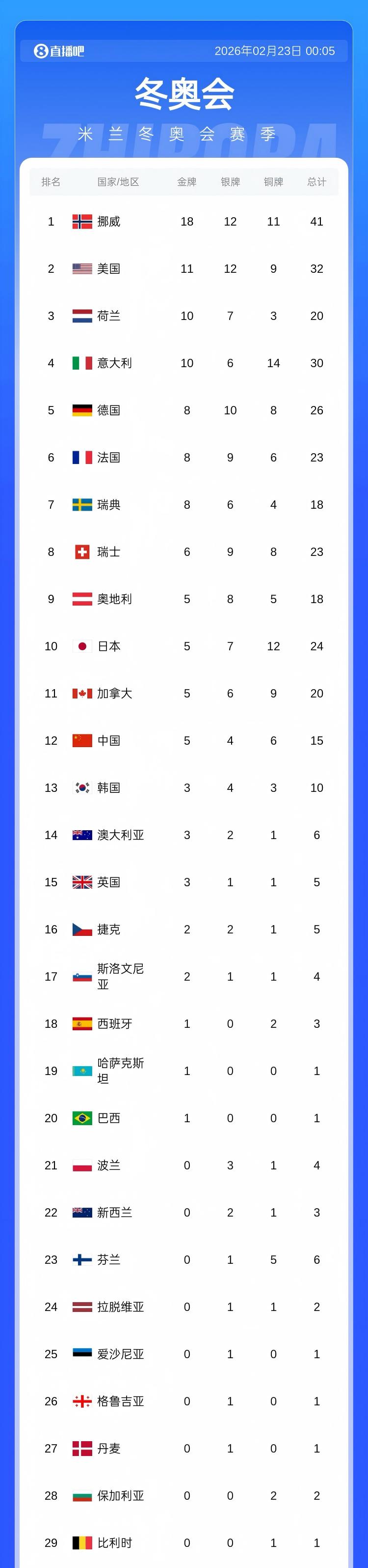 最终奖牌榜:挪威连续4届霸榜 中国5金4银6铜创境外参赛最好成绩