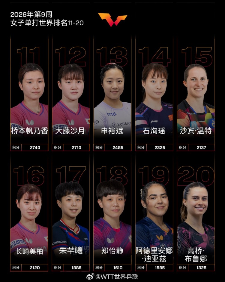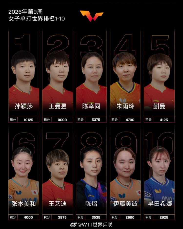 2月23日消息 今日,国际乒联公布了2026年第9周女单世界排名,前十球员里有6名国乒选手,其中孙颖莎、王曼昱、陈幸同位列前三,蒯曼第5位,王艺迪第7,陈熠第8。