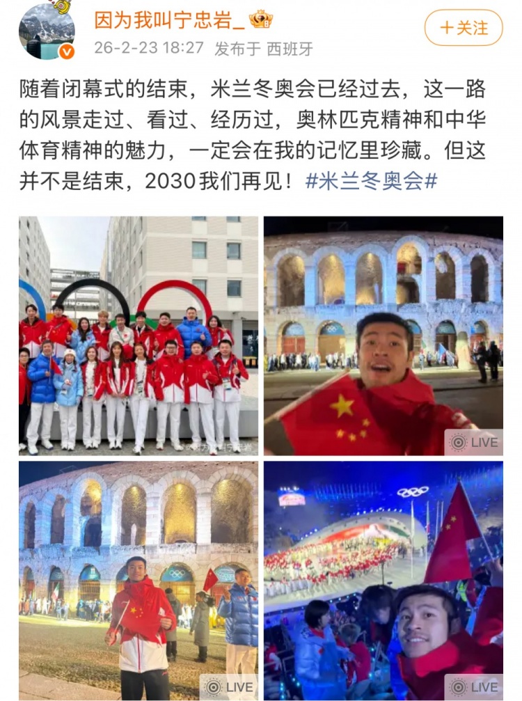 宁忠岩社媒:米兰冬奥会会在自己的记忆里珍藏,2030我们再见!