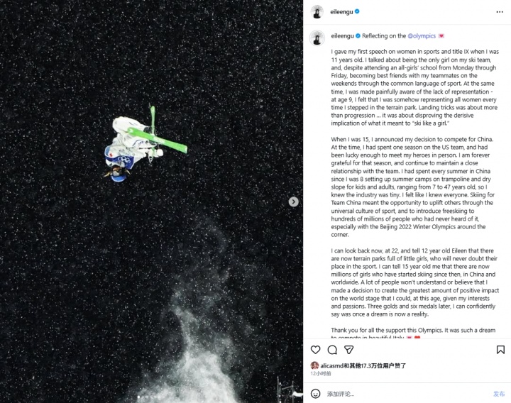 谷爱凌发长文:如今已有数百万女孩接触滑雪,曾经的梦想已成现实