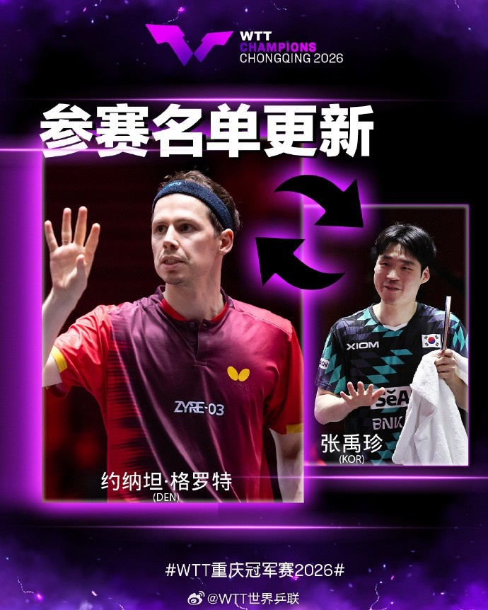 WTT重庆冠军赛将于2026年3月10日至15日举办,根据WTT官方消息,韩国选手张禹珍也退出本届赛事,约纳坦·格罗特递补参赛。