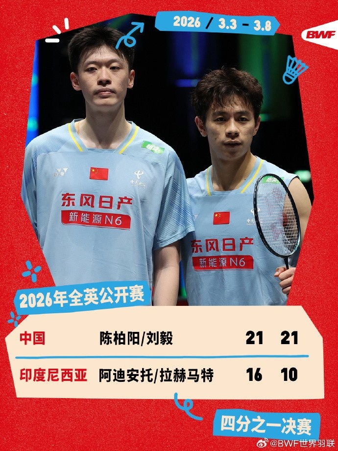 3月7日消息 全英羽毛球公开赛男双1/4决赛,陈柏阳/刘毅2-0战胜阿迪安托/拉赫马特,晋级四强。