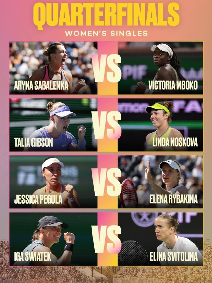 IW女单八强对阵:萨巴伦卡vs姆博科、斯瓦泰克vs斯维托丽娜