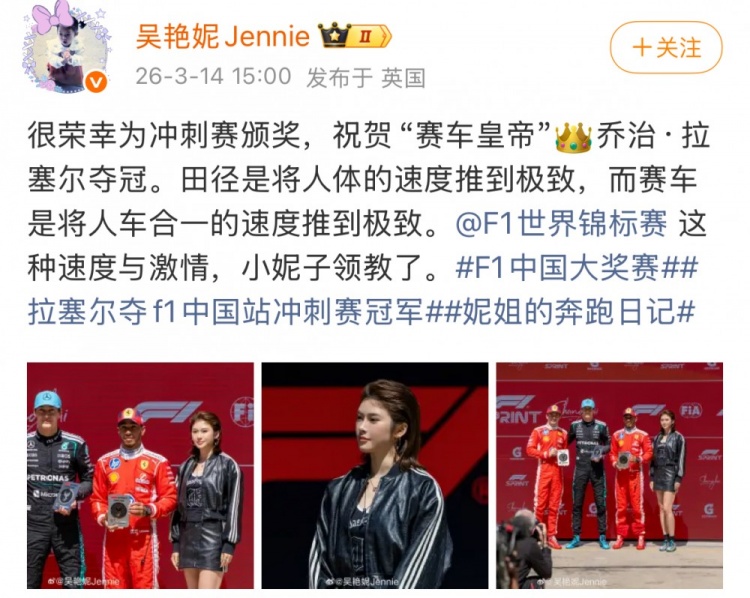 吴艳妮晒冲刺赛颁奖照:非常荣幸,领教了F1赛车的速度与激情