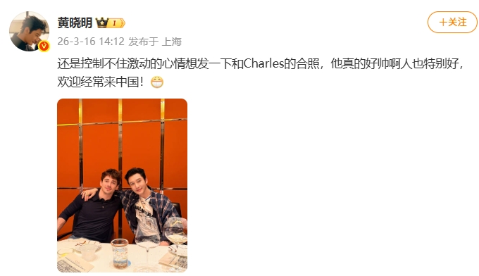 黄晓明写道:还是控制不住激动的心情想发一下和Charles的合照,他真的好帅啊人也特别好,欢迎经常来中国!