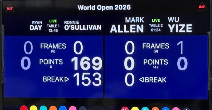 第一局奥沙利文单杆打出罕见的153分。 由于瑞恩·戴违规,奥沙利文通过自由球上手,完成了单杆清台的壮举。