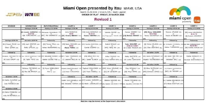 3月21日消息 WTA官方宣布,WTA1000迈阿密站六场比赛推迟到明天进行,其中包括郑钦文vs史蒂芬斯的比赛。