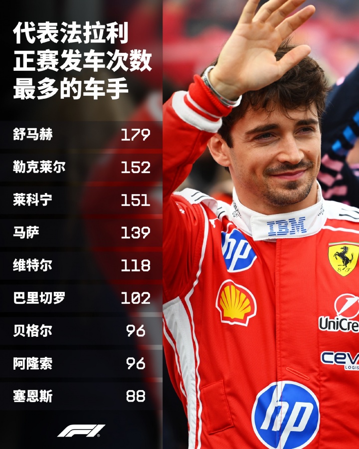 步入传奇 !勒克莱尔法拉利正赛出场152次队史第2,仅次于舒马赫