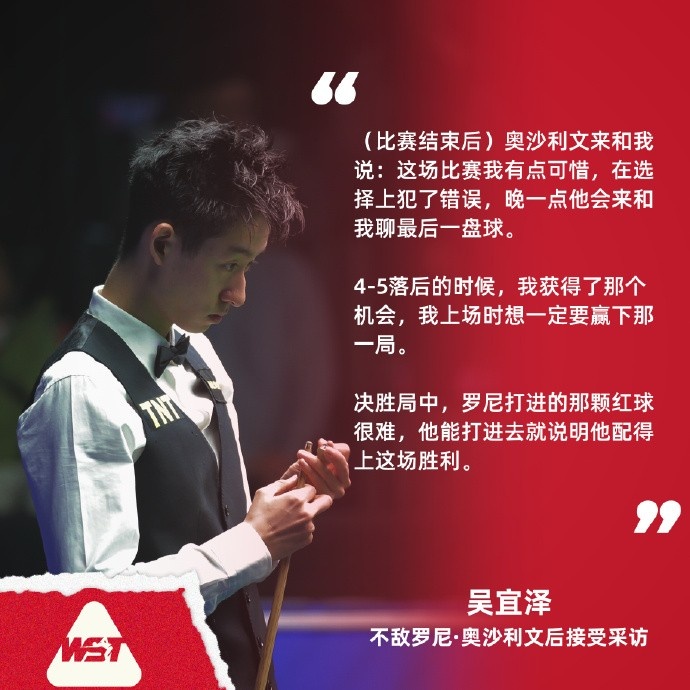 赛后,吴宜泽接受采访时表示:“(比赛结束后)奥沙利文来和我说:这场比赛我有点可惜,在选择上犯了错误,晚一点他会来和我聊最后一盘球。