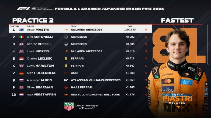 F1日本站二练:皮亚斯特里抢下头名,梅赛德斯二三位诺里斯第四