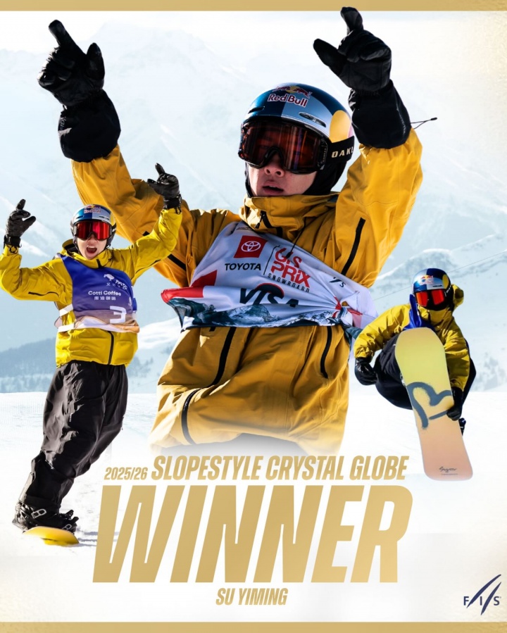 本赛季男子单板坡面障碍世界杯赛事已成功举办三站,分别为美国阿斯彭、瑞士拉克斯和奥地利弗拉绍战,已满足2025/26赛季颁发水晶杯总冠军所需的最低赛事数量要求。这意味着,以140分稳居榜首的中国选手苏翊鸣,将斩获坡面障碍技巧水晶杯总冠军。本赛季他战绩辉煌,此前已拿下大跳台水晶杯,并在2025/26米兰冬奥会上夺得坡面障碍技巧金牌、大跳台铜牌。