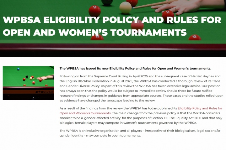 继2025年4月最高法院相关裁决,以及2025年8月哈丽特・海恩斯诉英格兰落袋式台球联合会一案后,世界职业台球和斯诺克协会已对其《跨性别及性别多元群体参赛政策》展开全面审查。本次审查过程中,协会采纳了多方专业法律意见。