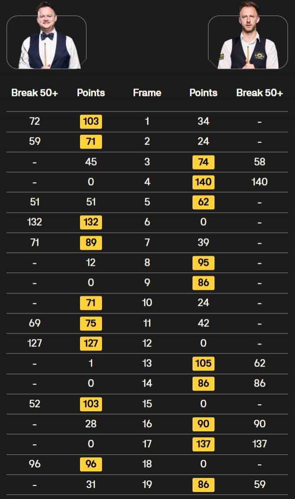 04月02日消息 2026世界斯诺克巡回锦标赛1/4决赛,全场比赛贾德·特鲁姆普打出两杆破百(140、137)和五杆50+(58、62、86、90、59),肖恩·墨菲打出两杆破百(132、127)和七杆50+(72、59、51、71、69、52、96)。