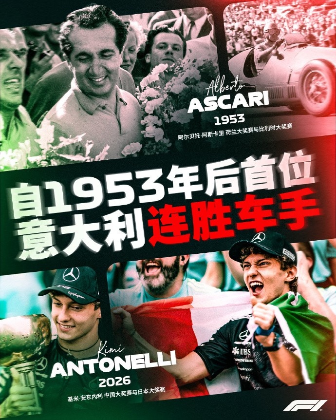 4月2日消息 据F1官方统计,安东内利是73年来首位意大利连胜车手。