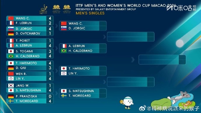 中国澳门乒乓球世界杯男单八强:王楚钦vs达科、张本智和vs林昀儒