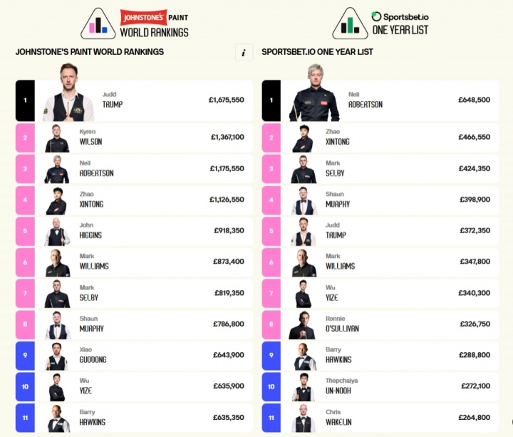 最新的单赛季排名,赵心童仍居赛季第二,罗伯逊赛季第一。