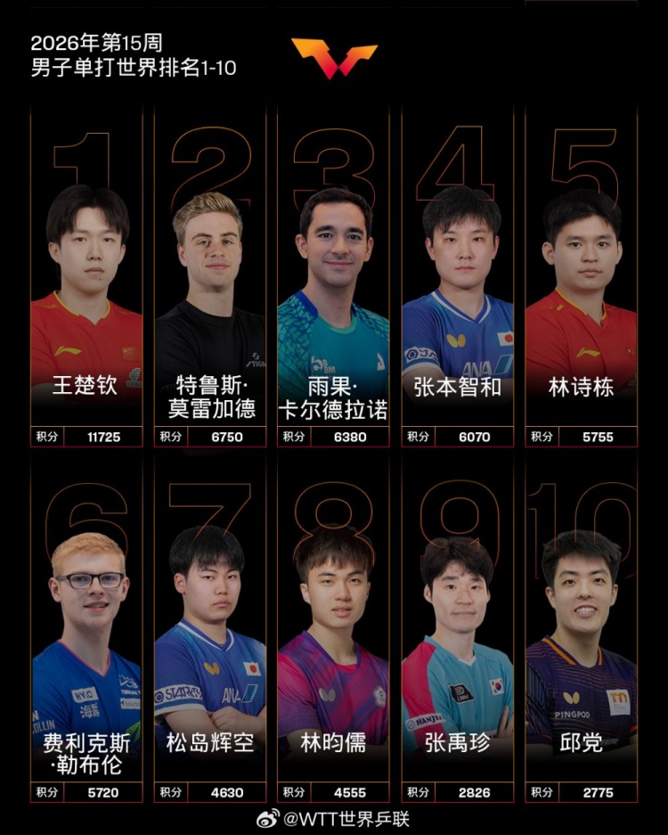 国际乒联2026年第15周世界排名:孙颖莎和王楚钦领跑