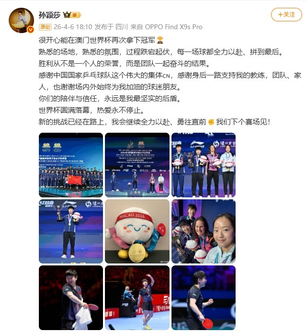 三连冠!孙颖莎社媒:新的挑战已在路上,会继续全力以赴勇往直前
