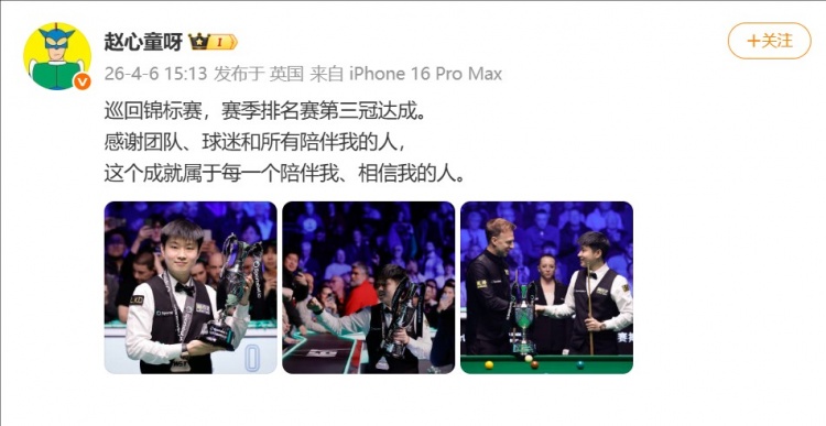 赵心童写道:“巡回锦标赛,赛季排名赛第三冠达成。感谢团队、球迷和所有陪伴我的人,这个成就属于每一个陪伴我、相信我的人。 ”