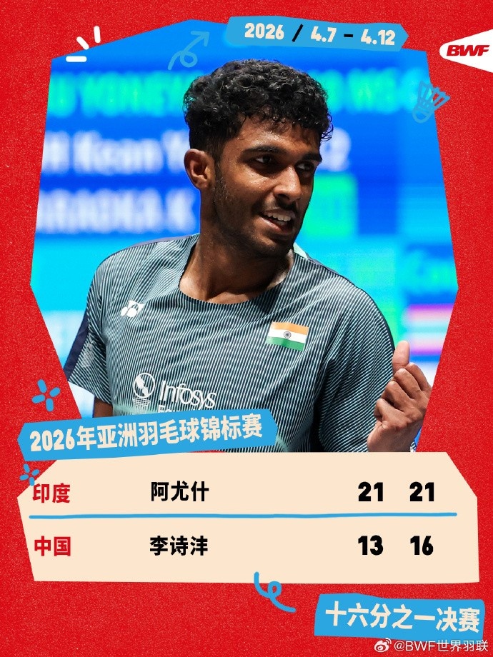 4月8日消息 2026年亚洲羽毛球锦标赛首轮,李诗沣0-2不敌阿尤什,止步男单首轮。