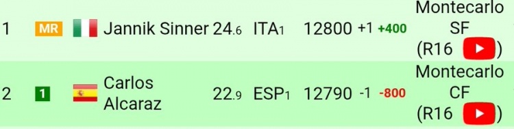 作为蒙特卡洛大师赛的卫冕冠军,阿尔卡拉斯在本站面临巨大的保分压力,目前率先晋级的辛纳以12800个积分位列世界第一,阿尔卡拉斯12790分滑落至第2。