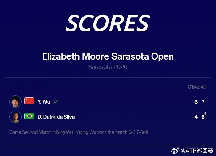 4月11日消息 ATP挑战赛萨拉索塔站1/4决赛,头号种子吴易昺2-0击败巴西选手达席尔瓦,晋级四强。