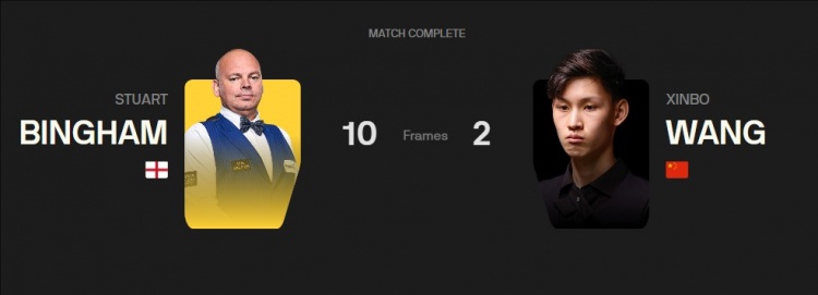 本场比赛,宾汉姆一上来送出9连鞭,以9-0领先王信伯,随后王信伯连追2局,最终2-10不敌宾汉姆。