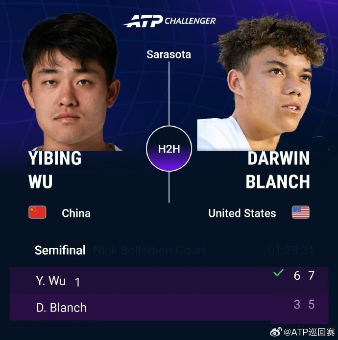 4月12日消息 ATP挑战赛萨拉索塔站半决赛,头号种子吴易昺直落两盘击败布兰奇,晋级决赛。