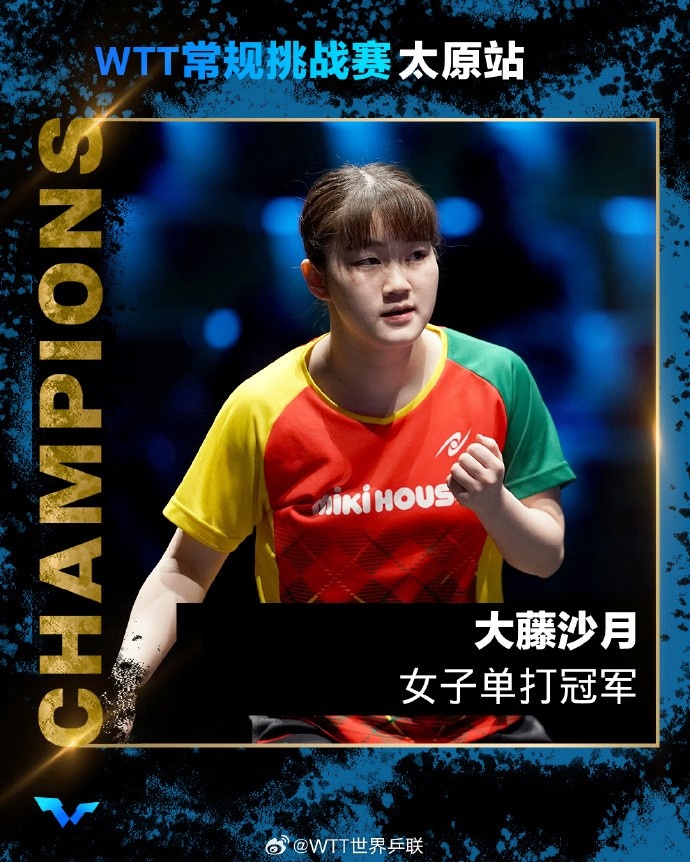 4月12日消息 WTT常规挑战赛太原站女单决赛,大藤沙月4比1战胜佐藤瞳获得女单冠军。