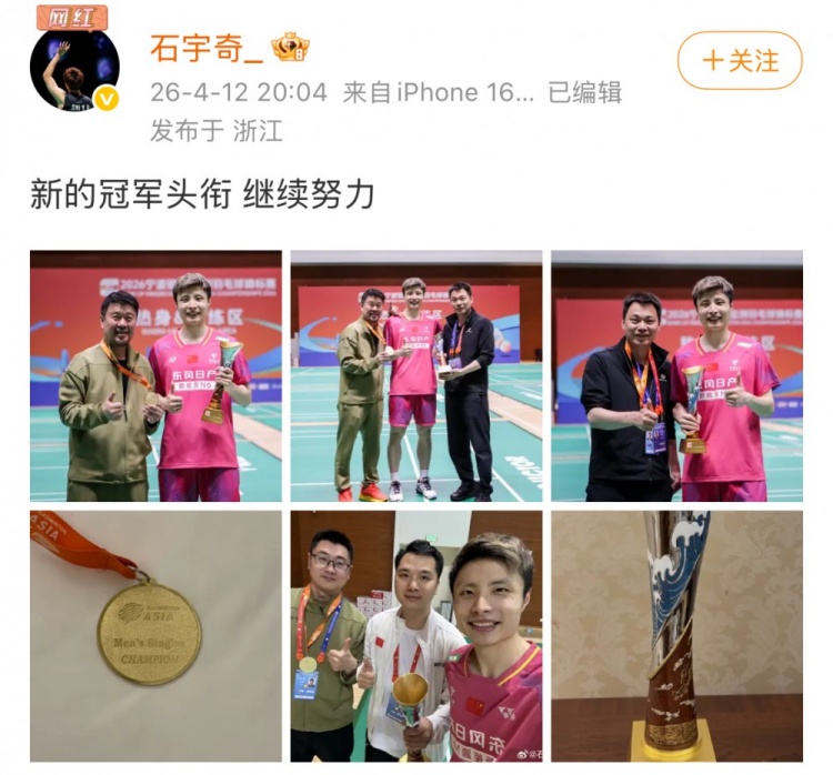 赛后石宇奇更新社媒,晒出冠军奖杯奖牌照等,并配文写道:“新的冠军头衔,继续努力。”