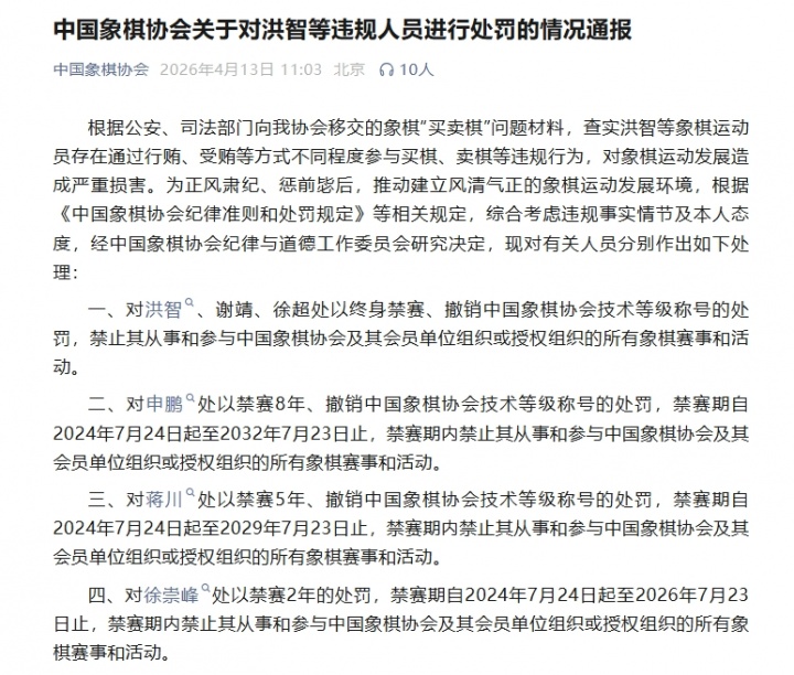04月13日消息 中国象棋协会发布了关于对洪智等违规人员进行处罚的情况通报,这是象棋“买卖棋”事件发生后公布的第三批被处罚人员名单。当日通报的6名棋手中,洪智、谢靖、徐超被终身禁赛。