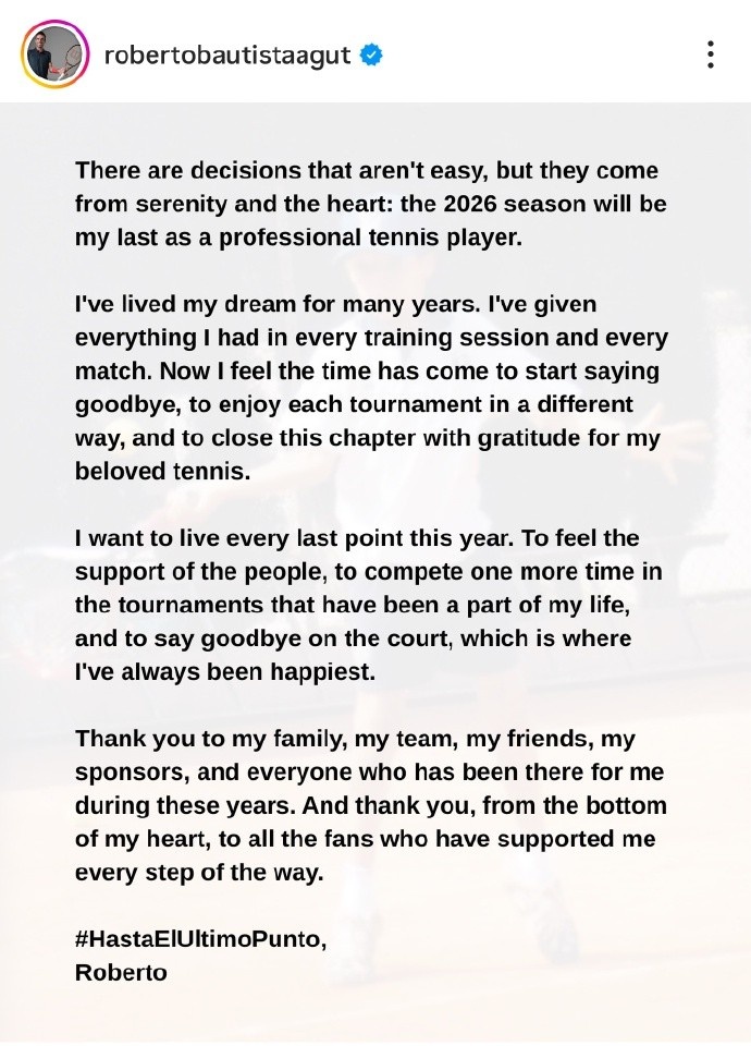 4月16日消息 官方消息,西班牙网球老将包蒂斯塔·阿古特宣布将在2026赛季结束后退役。