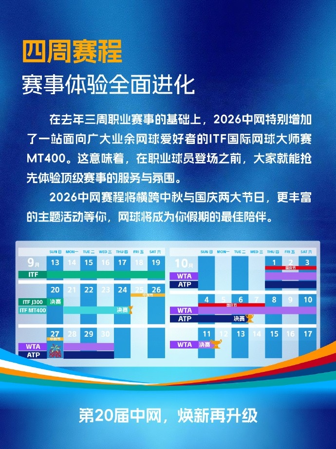 4月17日消息 中网官方发布2026年中网赛历,2026年中网赛程将横跨中秋与国庆两大节日。