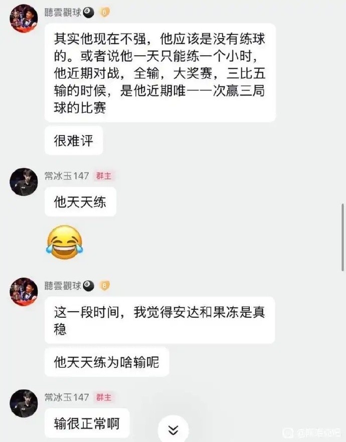 网友称:“丁俊晖现在不强,应该是没有练球的,或者说他一天只练习一个小时,他近期比赛全输了。”对此,中国斯诺克选手常冰玉在群内回应道:“他天天练球。”