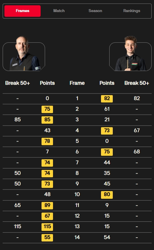 全场比赛马克·威廉姆斯打出一杆破百(115)和四杆50+(85、50、50、65),安东尼·科瓦尔斯基打出三杆50+(82、67、68)