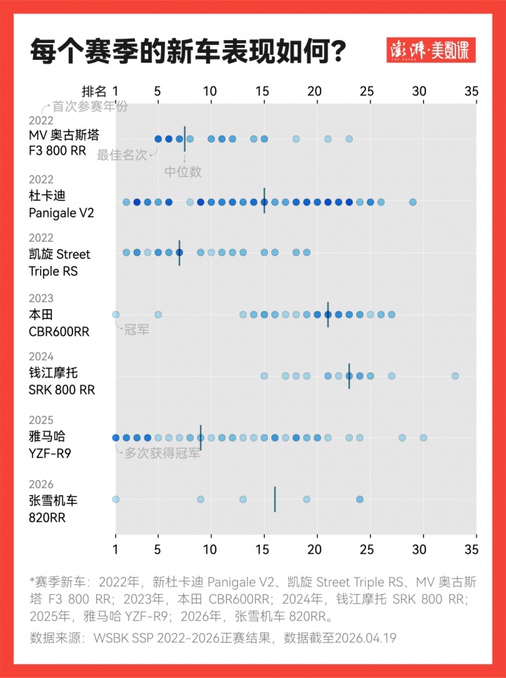 新规公布后,杜卡迪、凯旋、MV奥古斯塔加入新赛季角逐,他们的首次参赛赛季最佳成绩依次为:2 次亚军、2次亚军、7次第五名。自2022年新规以来,赛季新车只有本田、雅马哈、张雪机车出场即夺冠。