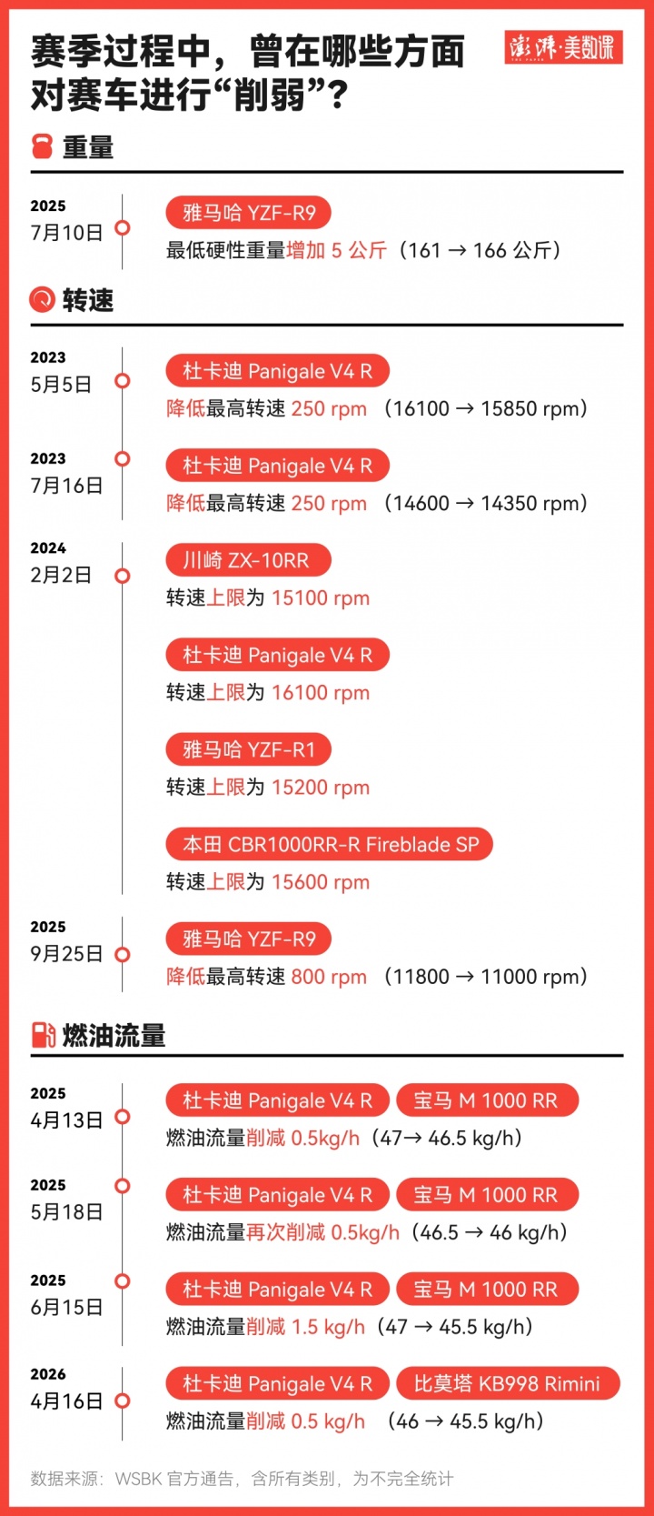 例如在2025赛季SBK赛事中,杜卡迪与宝马优势过于突出,FIM在荷兰站先将两车厂赛车燃油流量下调0.5千克/小时,却未能压制其竞争力,仍有不少车手抱怨杜卡迪性能过于激进。后续比赛中,二者仍包揽三连胜,FIM再度下调其燃油流量1.0千克/小时,累计降幅达1.5千克/小时。同年西班牙阿拉贡赛前,雅马哈R9也因多场连胜被增重5千克,转速上限被限制在11500转。
