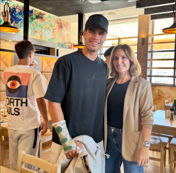 在退出ATP500巴塞罗那后,阿尔卡拉斯于上周五宣布不会参加马德里大师赛。正是由于在巴塞罗那对阵芬兰选手维尔塔宁的首轮比赛中,这位西班牙人的右前臂受伤。本周一,Restaurante Los Chopos的Instagram账号发布了一张这位世界第二的照片,照片中他的右臂带着护具。即便在劳伦斯盛典现场,这位西班牙天才也一直佩戴着该护具。前西班牙网球运动员洛佩兹透露,自己此前曾因为类似的伤病休战2个月,认为阿尔卡拉斯也几乎不可能参加罗马大师赛。