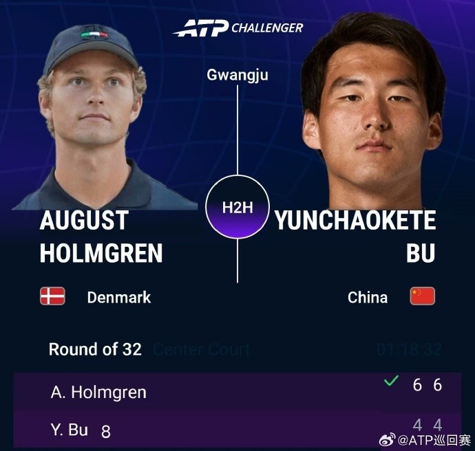布云朝克特两盘不敌霍姆格伦,止步ATP光州挑战赛首轮
