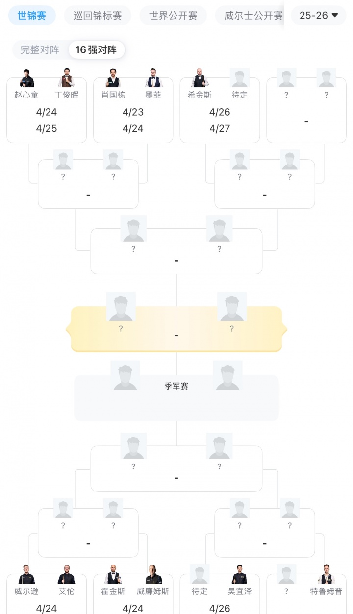 2026斯诺克世锦赛32进16轮次: