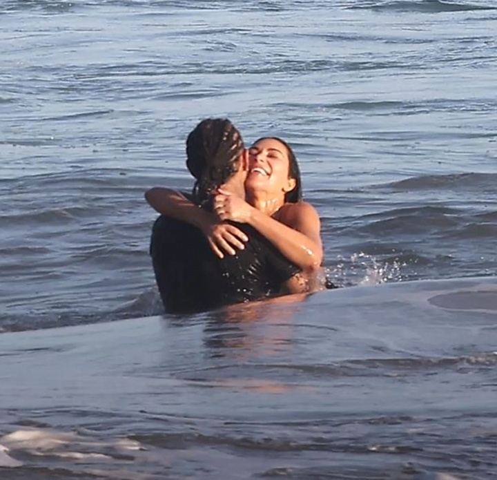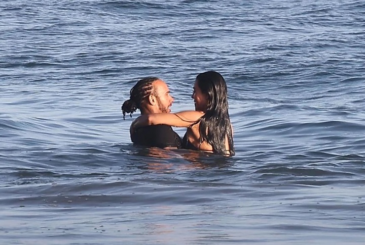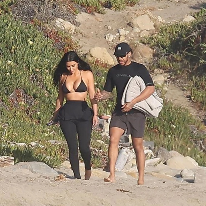 热恋中🥰41岁汉密尔顿和45岁金·卡戴珊约会,两人海中拥抱热吻